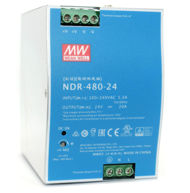 AC-DC Single output Industrial DIN rail power supply; Output 24Vdc at 20A; metal case. Mean Well NDR-480-24 AC/DC DIN Rail 24V 20A Power Supply.